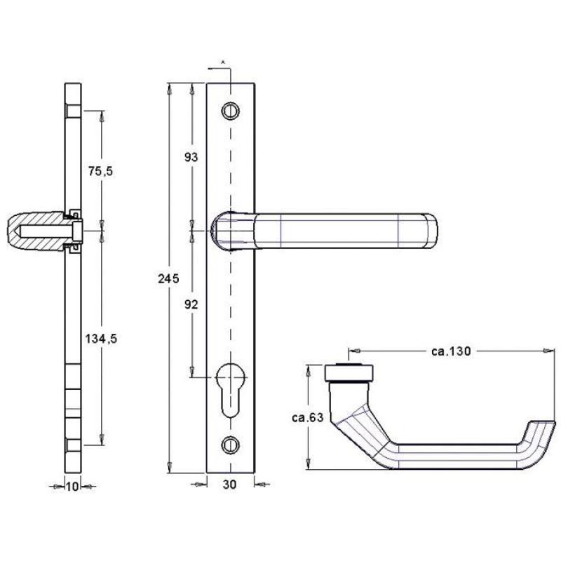 für Rahmentüren · Entfernung 92 mm · Vierkant 8 mm · PZ-gelocht · Drücker fest-drehbar gelagert · massive Schilder · eckig · Stärke 10 mm · Höhe 245 mm · Breite 30 mm · Verschraubung von innen nach außen · innen sichtbar verschraubt · für Türstärke 68-75 mm · DIN links / rechts · Lieferung inkl. Stift und Schrauben