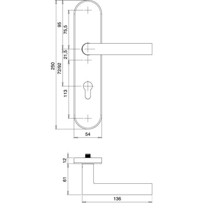 Weitere technische Eigenschaften · Breite: 54mm · Länge: 250mm · Abdeckung: ohne Zylinderabdeckung · Schildstärke: 12 mm · Schutzgarnitur Logo · 8743/7203 Alu.F1 72mm · 35-45mm EDI ·