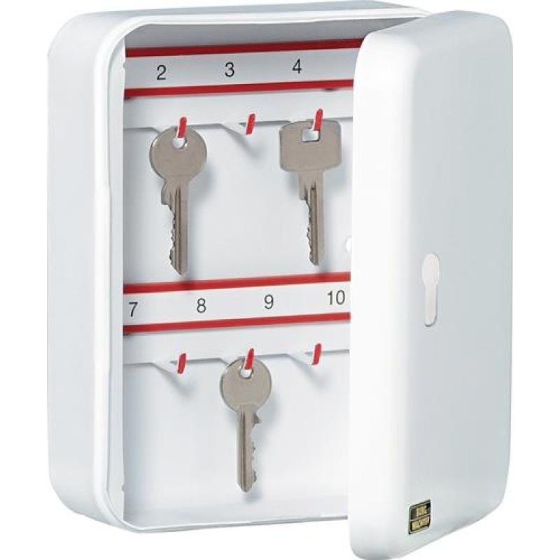 CityLine · solide Schlüsselbox · mit Messing-Stiftzylinder · Hakenleisten fortlaufend nummeriert · Hakenköpfe mit roten Kunststoffkäppchen gesichert · Papierstreifen rückseitig neutral, für eine individuelle Beschriftung · lichtgrau (RAL 7035) · Hakenabstand: 30 mm · Version V-PZ · vorgerichtet für Profil-Halbzylinder · ohne Zylinder · integrierbar in Schließanlagen · wichtig: Die Schließnase muss bei 90° links arretierbar sein · Hakenabstand: 30 mm