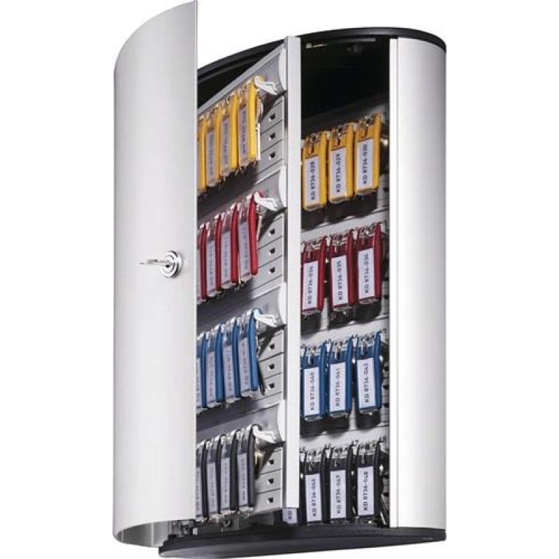 Design-Schlüsselschrank aus Aluminium · für 36 bzw. 72 Schlüsselanhänger KEY CLIP · hohe Sicherheit durch hochwertiges Schloss mit 2 Schlüsseln oder alternativ mit Zahlenschloss und individuell einstellbarem Code · neben einem Musterbeutel KEY CLIP (6 Stück sortiert) und einem Indexblatt in der Tür ist das Montagematerial im Lieferumfang enthalten · die Türöffnung von mehr als 90 Grad ermöglicht einen leichten Zugriff · beide Ausführungen besitzen eine ausschwenkbare Zwischenwand · variable Steckhöhen der Schlüsselleisten erlauben eine individuelle Nutzung